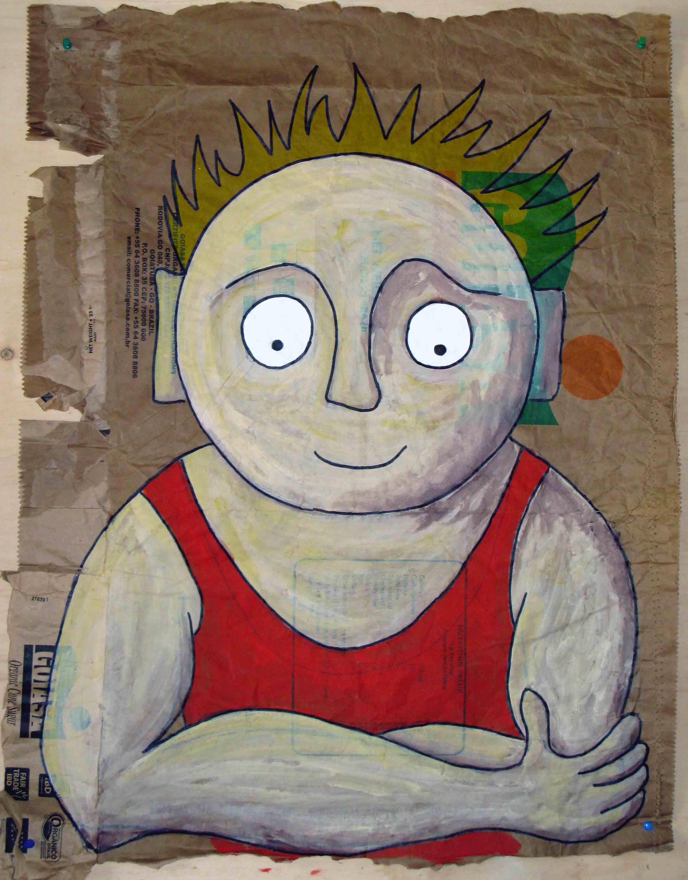 Le costaud au débardeur rouge acrylique et marqueur sur papier de récupération (sac de sucre), 75 cm x 98 cm.