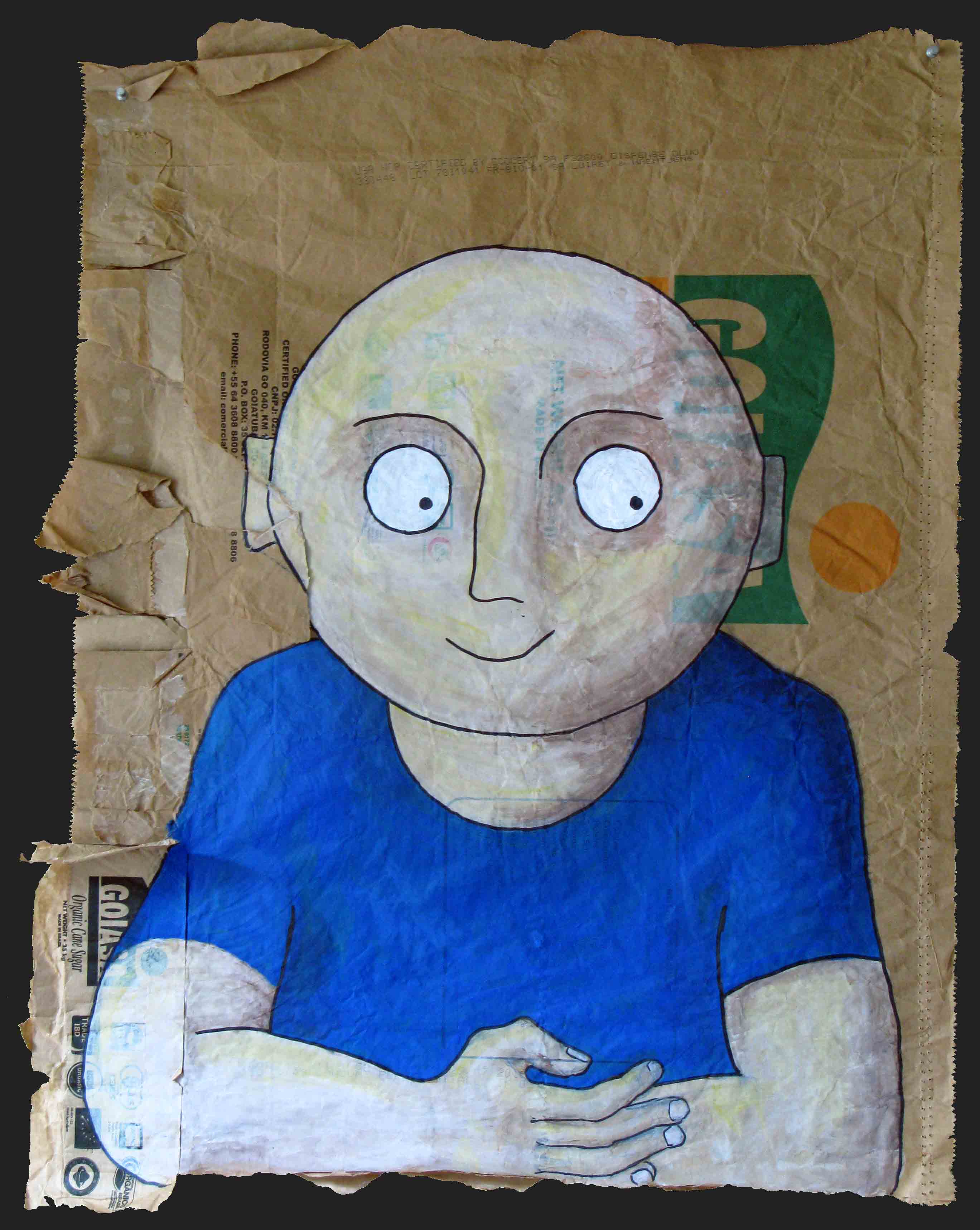 Mais que fait mon voisin de gauche ? Acrylique et marqueur sur papier de récupération (sac de sucre de 25 kg) 75 x 98 cm