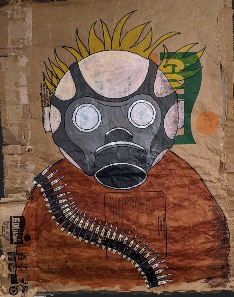 Parfum du front Est Le fond de l’air effraie Acrylique et marqueur sur papier de récupération (sac de sucre de 25 kg) 75 x 98 cm